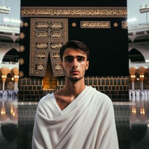 تبادل الوجوه مع صورة شاب بالحج في المساء أمام الكعبة