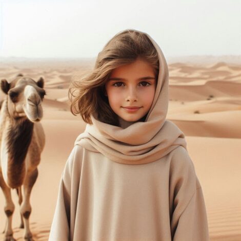 تخيلي نفسك في صحراء شاسعة بجوار جمل ضخم، ترتدين عباءة بلون الرمل وتبتسمين للكاميرا. الآن، مع تقنيتنا المتقدمة في تبديل…