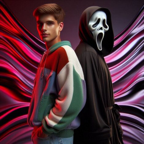 جرب تبديل الوجه بذكاء اصطناعي مع شاب مصري يقف بجانب قاتل صرخة في مشهد سينمائي