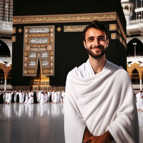 تبادل الوجوه مع صورة شاب واقف أمام الكعبة بملابس الإحرام
