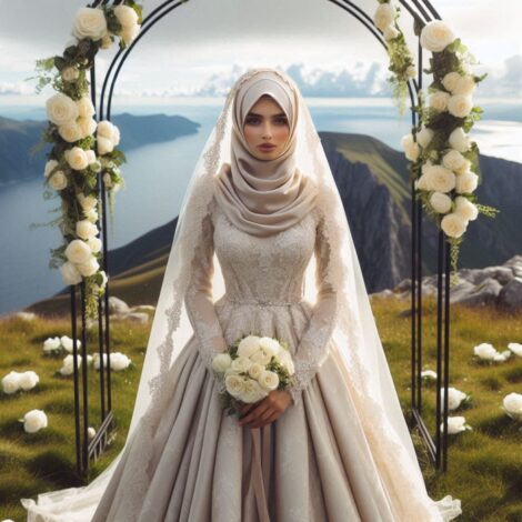 في موقع tfotos.com، يمكنك الآن تجربة تبادل الوجوه مع هذه الصورة التي تُظهر عروساً محجبة بفستان زفاف جميل وسط الطبيعة…